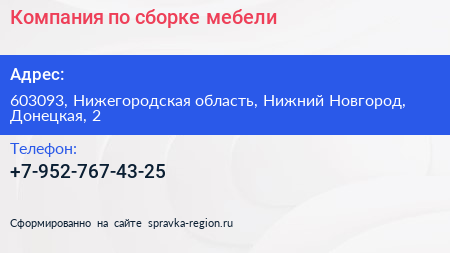 Компания по сборке мебели по адресу 603093, Нижегородская область, Нижний Новгород, Донецкая, 2 в дальнейшем Организация, размещена в следующих категориях: