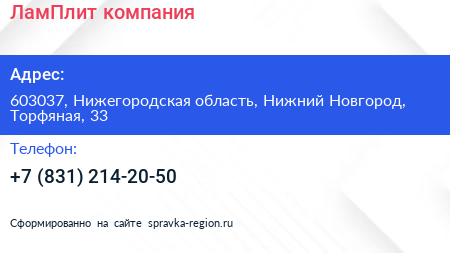 ЛамПлит, компания по адресу 603037, Нижегородская область, Нижний Новгород, Торфяная, 33 в дальнейшем Организация, размещена в следующих категориях: