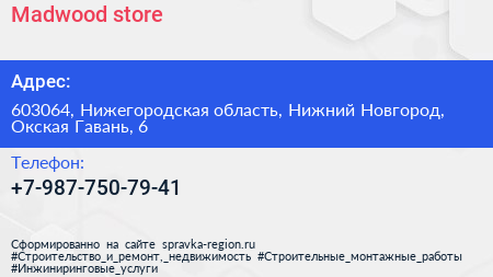 Madwood.store по адресу 603064, Нижегородская область, Нижний Новгород, Окская Гавань, 6 в дальнейшем Организация, размещена в следующих категориях: