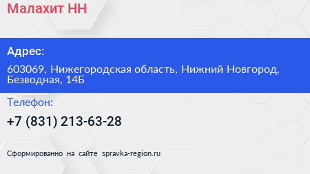 Малахит НН по адресу 603069, Нижегородская область, Нижний Новгород, Безводная, 14Б в дальнейшем Организация, размещена в следующих категориях: