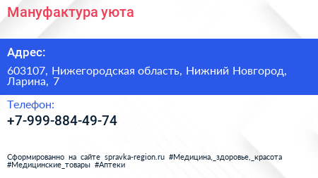 Мануфактура уюта по адресу 603107, Нижегородская область, Нижний Новгород, Ларина, 7 в дальнейшем Организация, размещена в следующих категориях: