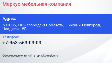 Маркус, мебельная компания по адресу 603035, Нижегородская область, Нижний Новгород, Чаадаева, 8Б в дальнейшем Организация, размещена в следующих категориях: