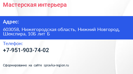 Мастерская интерьера по адресу 603058, Нижегородская область, Нижний Новгород, Шекспира, 10Б лит Б в дальнейшем Организация, размещена в следующих категориях: