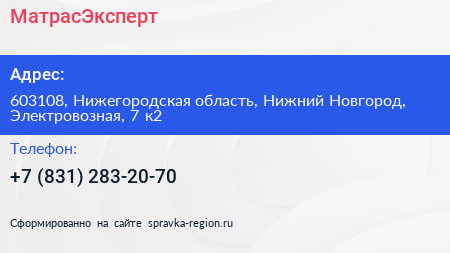 МатрасЭксперт по адресу 603108, Нижегородская область, Нижний Новгород, Электровозная, 7 к2 в дальнейшем Организация, размещена в следующих категориях: