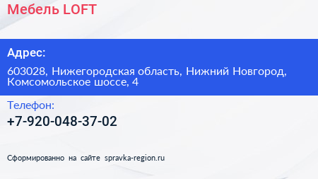 Мебель LOFT по адресу 603028, Нижегородская область, Нижний Новгород, Комсомольское шоссе, 4 в дальнейшем Организация, размещена в следующих категориях: