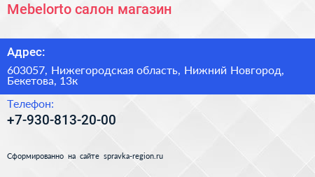 Mebelorto, салон-магазин по адресу 603057, Нижегородская область, Нижний Новгород, Бекетова, 13к в дальнейшем Организация, размещена в следующих категориях:
