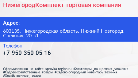 НижегородКомплект, торговая компания по адресу 603135, Нижегородская область, Нижний Новгород, Снежная, 20 к1 в дальнейшем Организация, размещена в следующих категориях:
