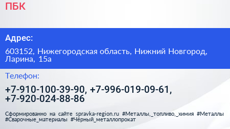 ПБК по адресу 603152, Нижегородская область, Нижний Новгород, Ларина, 15а в дальнейшем Организация, размещена в следующих категориях: