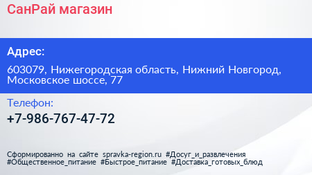СанРай, магазин по адресу 603079, Нижегородская область, Нижний Новгород, Московское шоссе, 77 в дальнейшем Организация, размещена в следующих категориях: