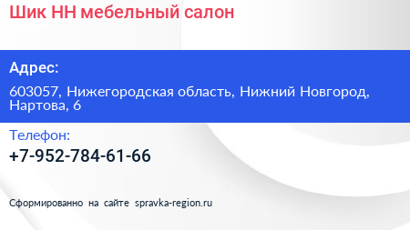 Шик-НН, мебельный салон по адресу 603057, Нижегородская область, Нижний Новгород, Нартова, 6 в дальнейшем Организация, размещена в следующих категориях: