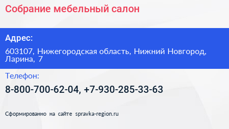 Собрание, мебельный салон по адресу 603107, Нижегородская область, Нижний Новгород, Ларина, 7 в дальнейшем Организация, размещена в следующих категориях: