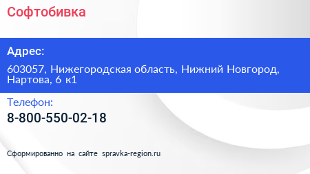Софтобивка по адресу 603057, Нижегородская область, Нижний Новгород, Нартова, 6 к1 в дальнейшем Организация, размещена в следующих категориях: