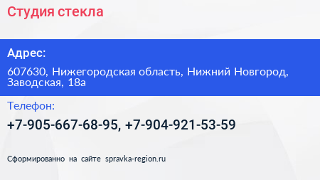 Студия стекла по адресу 607630, Нижегородская область, Нижний Новгород, Заводская, 18а в дальнейшем Организация, размещена в следующих категориях: