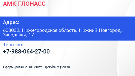 AMK ГЛОНАСС по адресу 603032, Нижегородская область, Нижний Новгород, Заводская, 17 в дальнейшем Организация, размещена в следующих категориях: