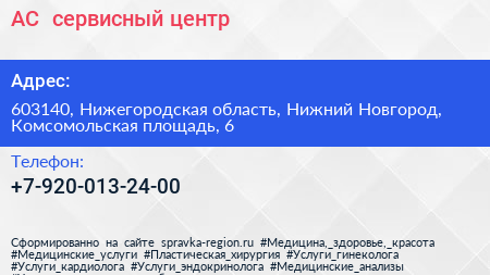 АС+, сервисный центр по адресу 603140, Нижегородская область, Нижний Новгород, Комсомольская площадь, 6 в дальнейшем Организация, размещена в следующих категориях: