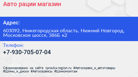 Авто+рации, магазин по адресу 603092, Нижегородская область, Нижний Новгород, Московское шоссе, 386Б к2 в дальнейшем Организация, размещена в следующих категориях: