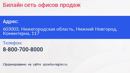 Билайн, сеть офисов продаж по адресу 603003, Нижегородская область, Нижний Новгород, Коминтерна, 117 в дальнейшем Организация, размещена в следующих категориях: