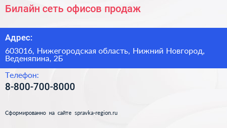 Билайн, сеть офисов продаж по адресу 603016, Нижегородская область, Нижний Новгород, Веденяпина, 2Б в дальнейшем Организация, размещена в следующих категориях: