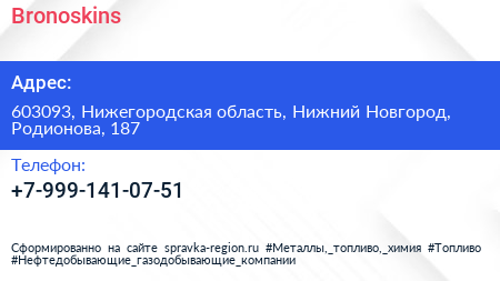Bronoskins по адресу 603093, Нижегородская область, Нижний Новгород, Родионова, 187 в дальнейшем Организация, размещена в следующих категориях: