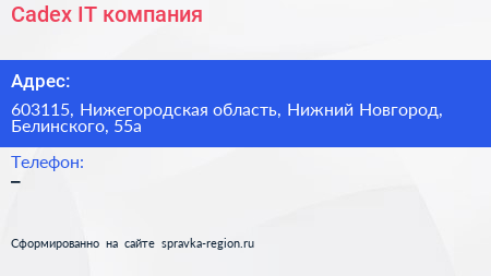 Cadex, IT-компания по адресу 603115, Нижегородская область, Нижний Новгород, Белинского, 55а в дальнейшем Организация, размещена в следующих категориях: