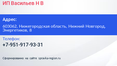 ИП Васильев Н.В. по адресу 603062, Нижегородская область, Нижний Новгород, Энергетиков, 8 в дальнейшем Организация, размещена в следующих категориях: