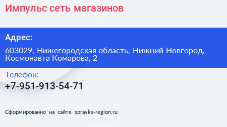 Импульс, сеть магазинов по адресу 603029, Нижегородская область, Нижний Новгород, Космонавта Комарова, 2 в дальнейшем Организация, размещена в следующих категориях: