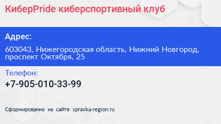 КиберPride, киберспортивный клуб по адресу 603043, Нижегородская область, Нижний Новгород, проспект Октября, 25 в дальнейшем Организация, размещена в следующих категориях: