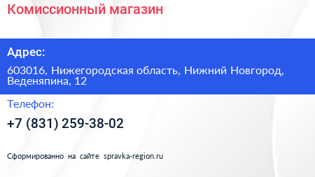 Комиссионный магазин по адресу 603016, Нижегородская область, Нижний Новгород, Веденяпина, 12 в дальнейшем Организация, размещена в следующих категориях:
