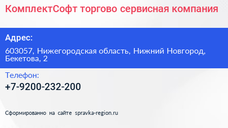 КомплектСофт, торгово-сервисная компания по адресу 603057, Нижегородская область, Нижний Новгород, Бекетова, 2 в дальнейшем Организация, размещена в следующих категориях: