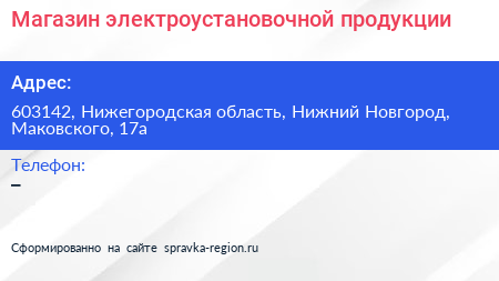 Магазин электроустановочной продукции по адресу 603142, Нижегородская область, Нижний Новгород, Маковского, 17а в дальнейшем Организация, размещена в следующих категориях: