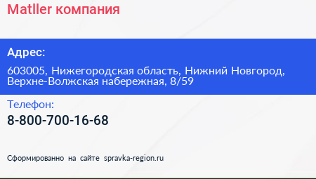 Matller, компания по адресу 603005, Нижегородская область, Нижний Новгород, Верхне-Волжская набережная, 8/59 в дальнейшем Организация, размещена в следующих категориях:
