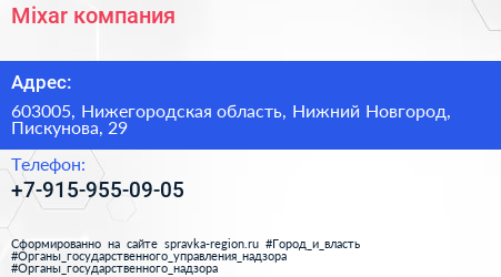 Mixar, компания по адресу 603005, Нижегородская область, Нижний Новгород, Пискунова, 29 в дальнейшем Организация, размещена в следующих категориях: