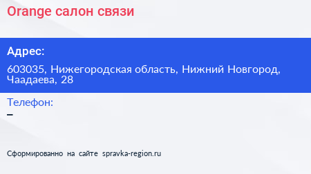 Orange, салон связи по адресу 603035, Нижегородская область, Нижний Новгород, Чаадаева, 28 в дальнейшем Организация, размещена в следующих категориях: