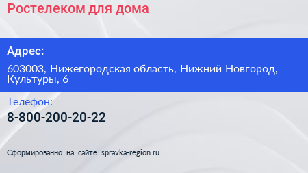 Ростелеком для дома по адресу 603003, Нижегородская область, Нижний Новгород, Культуры, 6 в дальнейшем Организация, размещена в следующих категориях: