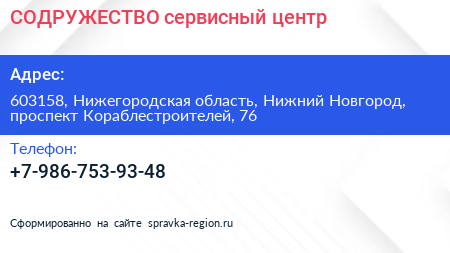 СОДРУЖЕСТВО, сервисный центр по адресу 603158, Нижегородская область, Нижний Новгород, проспект Кораблестроителей, 76 в дальнейшем Организация, размещена в следующих категориях: