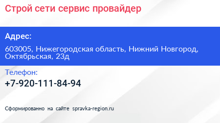 Строй сети, сервис-провайдер по адресу 603005, Нижегородская область, Нижний Новгород, Октябрьская, 23д в дальнейшем Организация, размещена в следующих категориях: