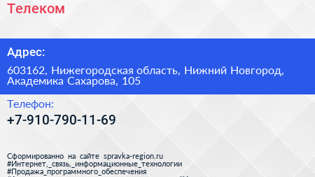 Телеком по адресу 603162, Нижегородская область, Нижний Новгород, Академика Сахарова, 105 в дальнейшем Организация, размещена в следующих категориях: