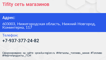 Tifity, сеть магазинов по адресу 603003, Нижегородская область, Нижний Новгород, Коминтерна, 117 в дальнейшем Организация, размещена в следующих категориях: