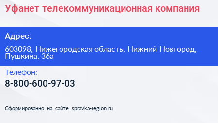 Уфанет, телекоммуникационная компания по адресу 603098, Нижегородская область, Нижний Новгород, Пушкина, 36а в дальнейшем Организация, размещена в следующих категориях: