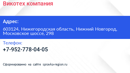Викотех, компания по адресу 603124, Нижегородская область, Нижний Новгород, Московское шоссе, 298 в дальнейшем Организация, размещена в следующих категориях: