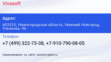 Vivasoft по адресу 603155, Нижегородская область, Нижний Новгород, Ульянова, 46 в дальнейшем Организация, размещена в следующих категориях: