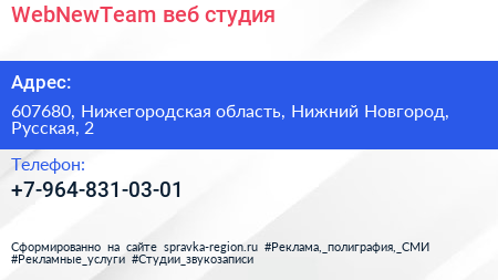 WebNewTeam, веб-студия по адресу 607680, Нижегородская область, Нижний Новгород, Русская, 2 в дальнейшем Организация, размещена в следующих категориях: