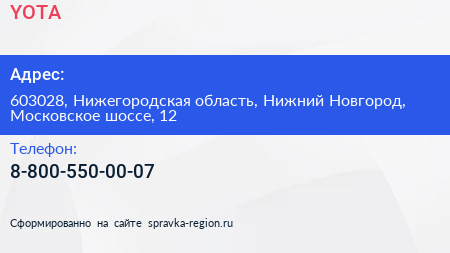 YOTA по адресу 603028, Нижегородская область, Нижний Новгород, Московское шоссе, 12 в дальнейшем Организация, размещена в следующих категориях: