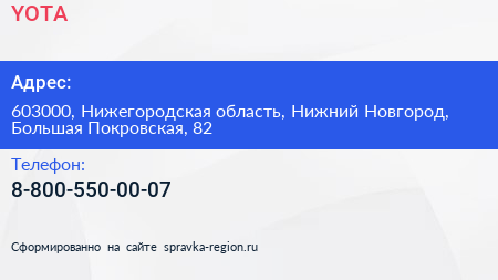 YOTA по адресу 603000, Нижегородская область, Нижний Новгород, Большая Покровская, 82 в дальнейшем Организация, размещена в следующих категориях: