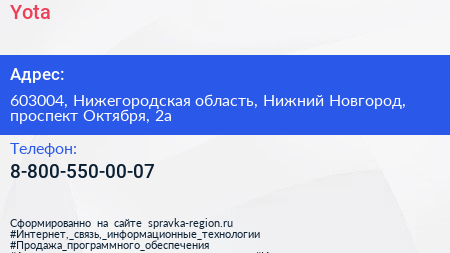 Yota по адресу 603004, Нижегородская область, Нижний Новгород, проспект Октября, 2а в дальнейшем Организация, размещена в следующих категориях: