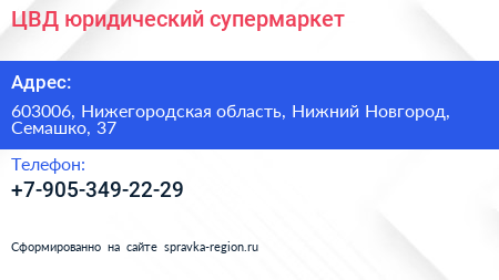 ЦВД, юридический супермаркет по адресу 603006, Нижегородская область, Нижний Новгород, Семашко, 37 в дальнейшем Организация, размещена в следующих категориях: