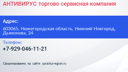 АНТИВИРУС, торгово-сервисная компания по адресу 603065, Нижегородская область, Нижний Новгород, Дьяконова, 24 в дальнейшем Организация, размещена в следующих категориях: