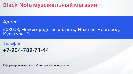 Black-Nota, музыкальный магазин по адресу 603003, Нижегородская область, Нижний Новгород, Культуры, 3 в дальнейшем Организация, размещена в следующих категориях: