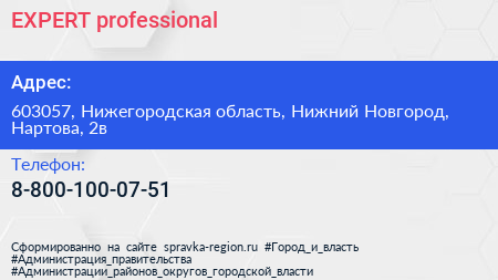 EXPERT professional по адресу 603057, Нижегородская область, Нижний Новгород, Нартова, 2в в дальнейшем Организация, размещена в следующих категориях: