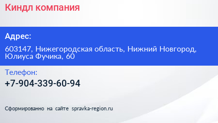 Киндл, компания по адресу 603147, Нижегородская область, Нижний Новгород, Юлиуса Фучика, 60 в дальнейшем Организация, размещена в следующих категориях: